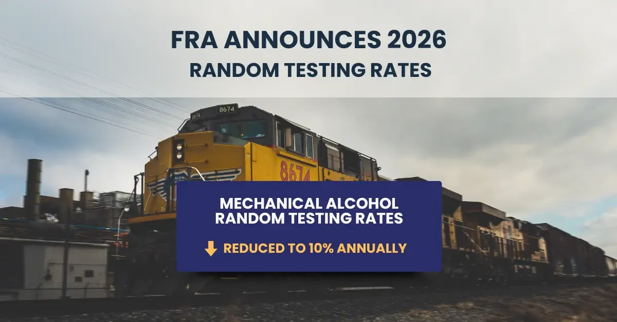 Effective January 8, 2026 — The Federal Railroad Administration has set minimum random testing rates for the new calendar year. Railroad carriers and contractors subject to FRA Part 219 regulations must meet these minimums across three employee categories: Covered Service, Maintenance-of-Way (MOW), and Mechanical (MECH).
